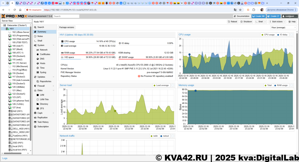 В качестве основного сервера у меня выступает сборка на китайской двухголовой материнке. Хуананжи или вроде того – уже года четыре прошло, шибко и не помню название. х99 -чо-та там. В общем собрал и забыл. Память ддр4 78Гб и 40 ядер (включая логические). Этот сервак – гипервизор, установил на него Проксмокс, так как машин требуется много разных из-за специфики разработок – работаю и по старым операционкам, и по линуксам, и по сетям, и чего только не делаю. Ну в общем домашняя лаборатория. Сайт этот, кстати, крутится тоже на этом сервере на одной из виртуальных машин. В общем сервер устраивает всем, только вот начинает заканчиваться место на дисках, в том числе на сетевых.