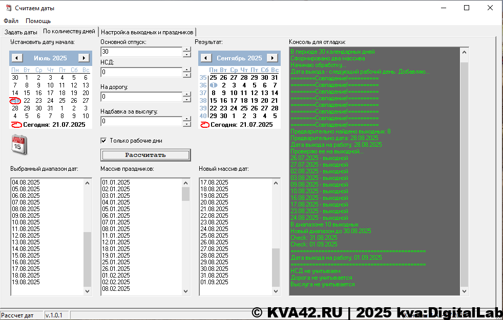 На днях дописал промежуточный рабочий вариант программы для расчета отпуска. Программа считает как календарные, так и рабочие дни, при этом есть возможность учета дополнительных дней на дорогу, за выслугу и за ненормированный служебный день. В целом программа написана для расчета отпуска сотрудников ФСИН России, однако в ближайшее время я сделаю ее более универсальной.