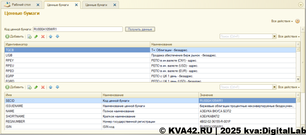 Всем привет! В этой заметке я бы хотел рассказать про вариант работы с мосбиржей через их апи прямо из 1С. Ранее я уже писал тут и тут про свою реализацию работы с ценными бумагами в 1С. В итоге сейчас моя обработка формирует справочник ценных бумаг, которые сейчас есть на рынке, записывает наменование, код, тикер и стоимость ценной бумаги. А используя форму для получения детальной информации можно по каждой ценной бумаге узнать гораздо больше информации. Мне вот очень полезно было видеть даты выплат и размер купонов и дивидендов.