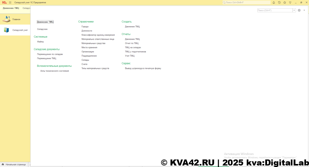 Конфигурация разработана для организации складского учета на предприятии. Среди основных возможностей конфигурации хочется отметить возможность количественного и стоимостного учета товарно-материальных ценностей (далее – ТМЦ), находящихся на балансе у материально-ответственных лиц.