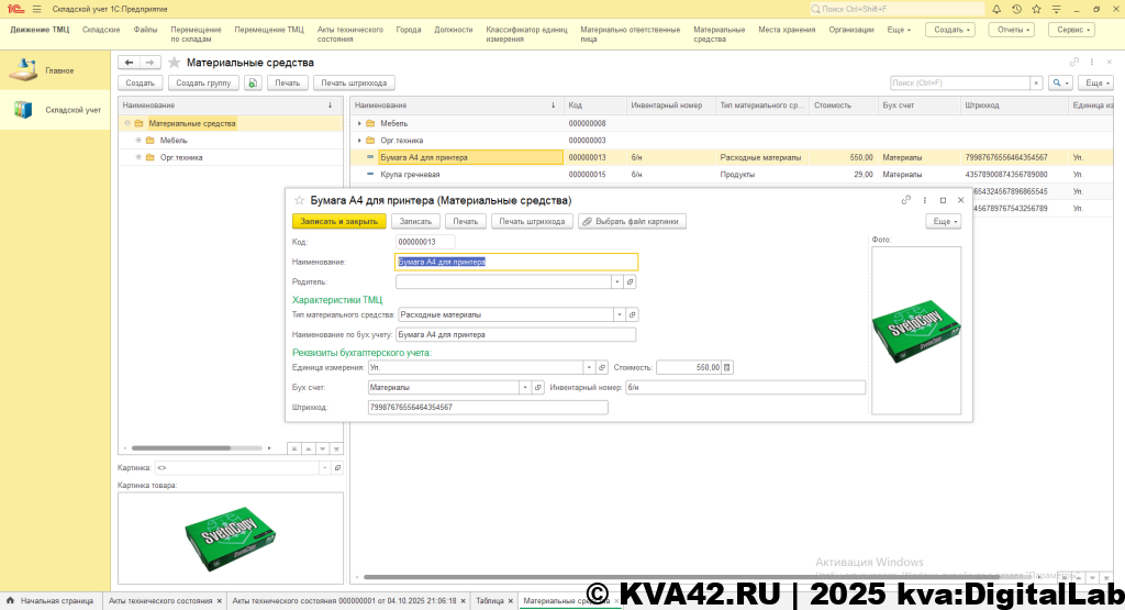 Конфигурация позволяет вести номенклатуру ТМЦ, учитывая единицы измерения, стоимость, номер счета по бухгалтерскому учету, инвентарный номер, а также прикреплять фотокарточку и выводить штрихкод для каждой позиции.