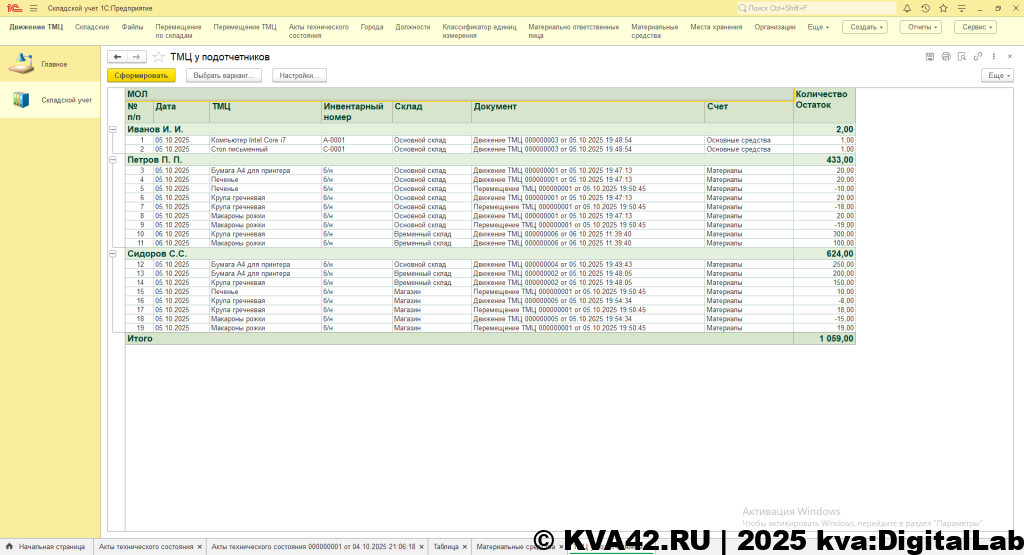 Конфигурация позволяет выводить отчеты. Всего реализовано пять отчетов – «Движение ТМЦ», «Отчет по ТМЦ», «ТМЦ на складах», «ТМЦ у подотчетников» и «Учет ТМЦ». В отчетах предусмотрены различные варианты отбора – по складам, по инвентарным номерам, по номенклатуре, по материально-ответственному лицу.