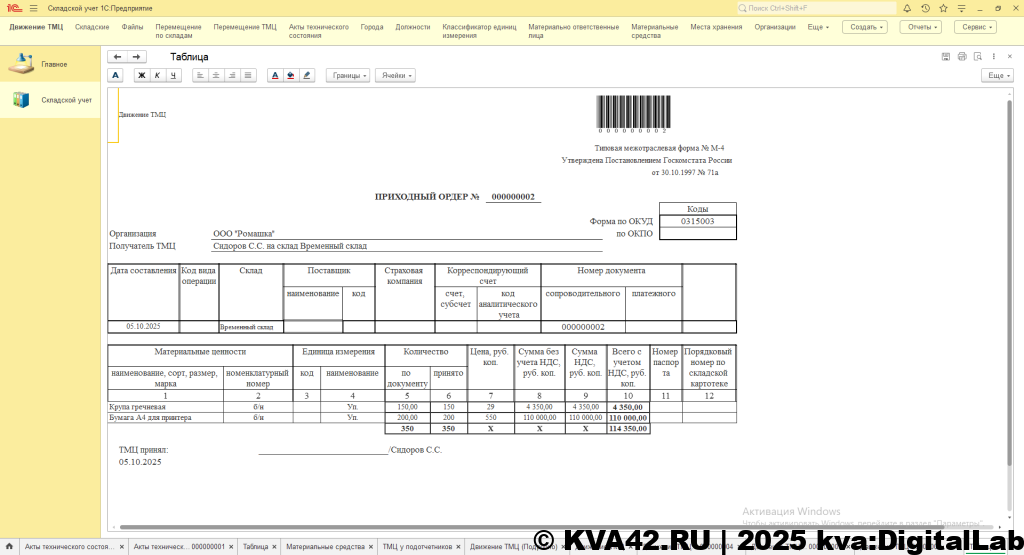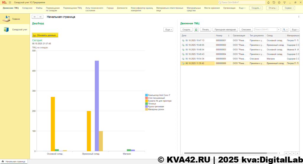 Конфигурация разработана для организации складского учета на предприятии. Среди основных возможностей конфигурации хочется отметить возможность количественного и стоимостного учета товарно-материальных ценностей (далее – ТМЦ), находящихся на балансе у материально-ответственных лиц.