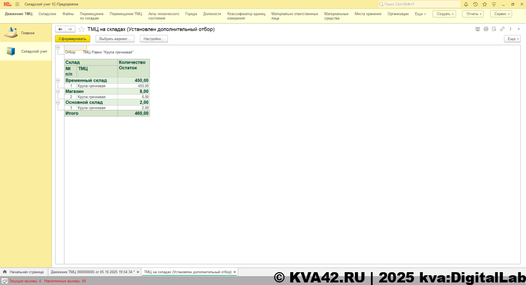 Конфигурация позволяет выводить отчеты. Всего реализовано пять отчетов – «Движение ТМЦ», «Отчет по ТМЦ», «ТМЦ на складах», «ТМЦ у подотчетников» и «Учет ТМЦ». В отчетах предусмотрены различные варианты отбора – по складам, по инвентарным номерам, по номенклатуре, по материально-ответственному лицу.