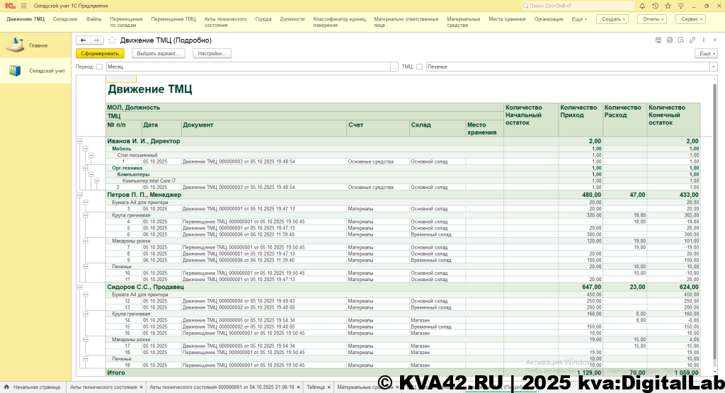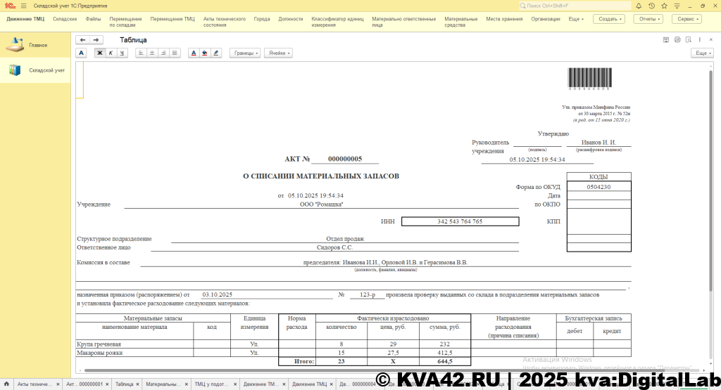 Учет ТМЦ организован документами «Движение ТМЦ» и «Перемещение ТМЦ». Документ «Движение ТМЦ» позволяет принять ТМЦ на баланс материально-ответственного лица, определить на каком складе будет числиться имущество, а также предусмотрена возможность уточнения конкретной позиции хранения ТМЦ на складе, то есть складом может быть к примеру Какой-либо филиал, а местом – номер кабинета в котором расположено имущество или же это может быть конкретный склад и конкретная полка на стеллаже в этом складе. Также документ «Движение ТМЦ» позволяет списывать ТМЦ с подотчетного лица, при этом учитывается наличие ТМЦ на складе, то есть нельзя провести документ в минус по остатку на складе. На любой вид движения имеется возможность печати документов – для поступления ТМЦ это приходный ордер, а для списания – акт о списании материальных запасов. Причем для списания есть возможность подготовить акт технического состояния материальных ценностей и указать его в основании для списания.